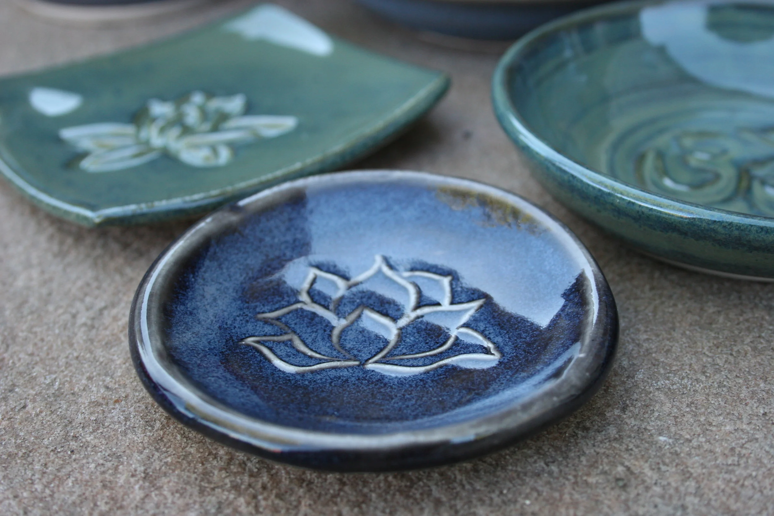 I've been invited to sell my pottery at Yoga Junction's fall fashion Trunk Show/Sale on Oct. 15. Since I normally don't put my pottery pieces in the "fashion" category, I had to think outside the box on yoga-inspires pots that might fit the theme.... I decided on small pots/dishes that could be used to hold meditation beads, jewelry, soap or loose change! Here is a sneak peak at a few of the pieces that just came out of the kiln this morning! I had a great time carving some yoga-inspired designs into my ceramic pieces - a real change from my norm.