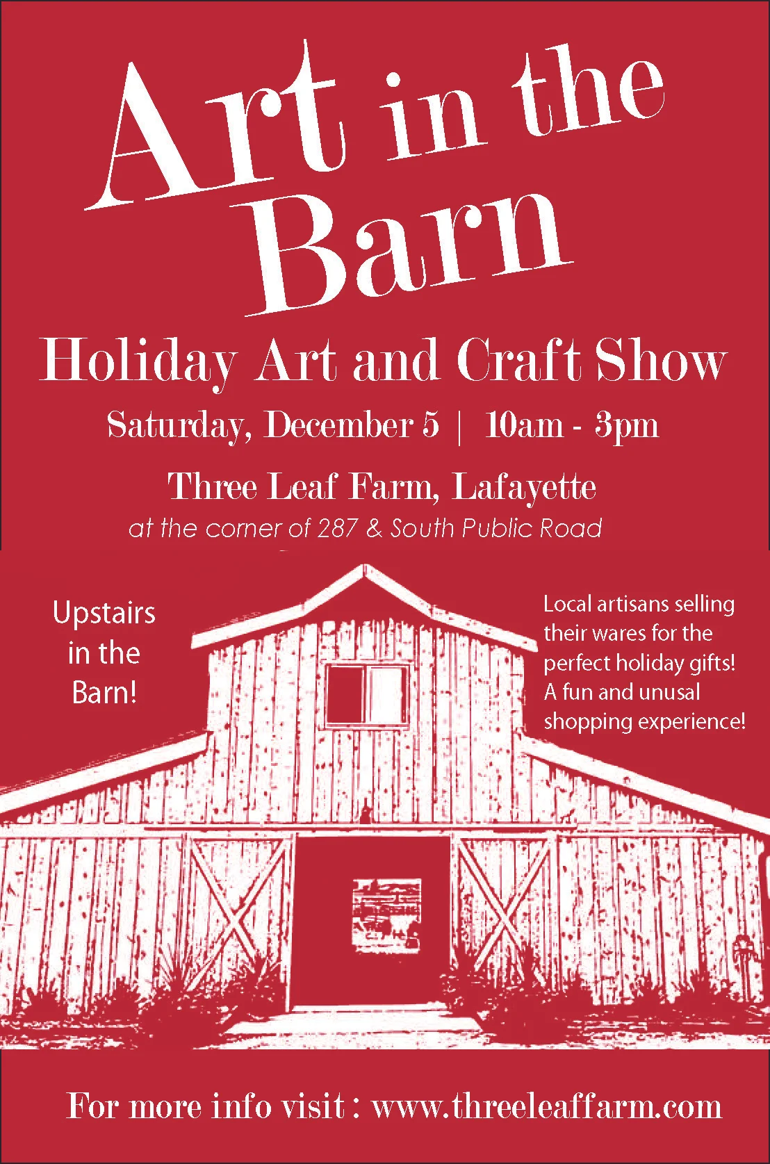 This year I'll be a participating artist at the Art in the Barn at Three Leaf Farm in Lafayette, CO on Saturday. Dec. 5, 2015 from 10am-3pm. This intimate art show will feature about 8 local artisans. Join us for a festive day of local art and holiday shopping in the upstairs of this beautiful barn! Three Leaf Farm is located at the corner of 287 & South Public Road.