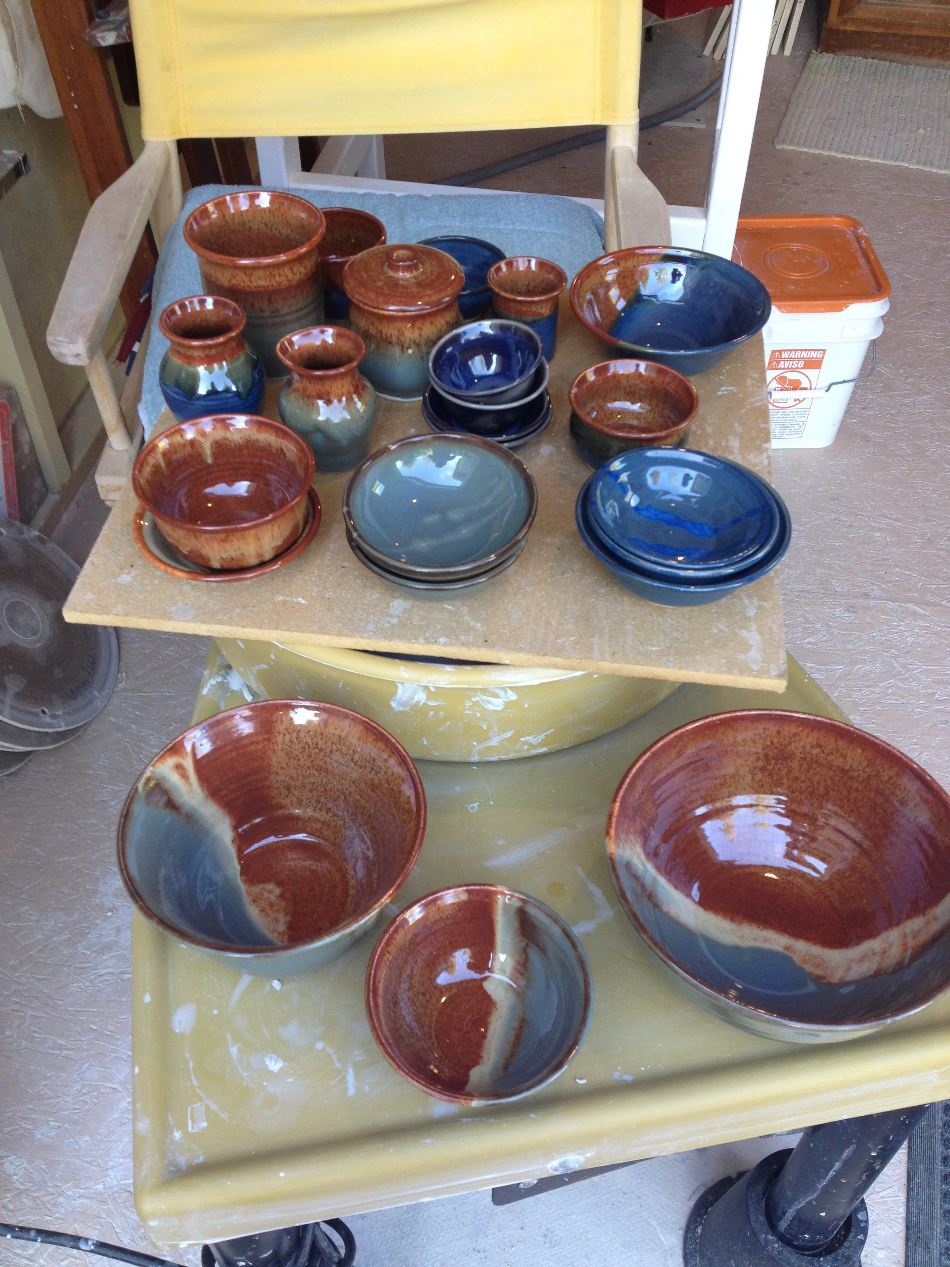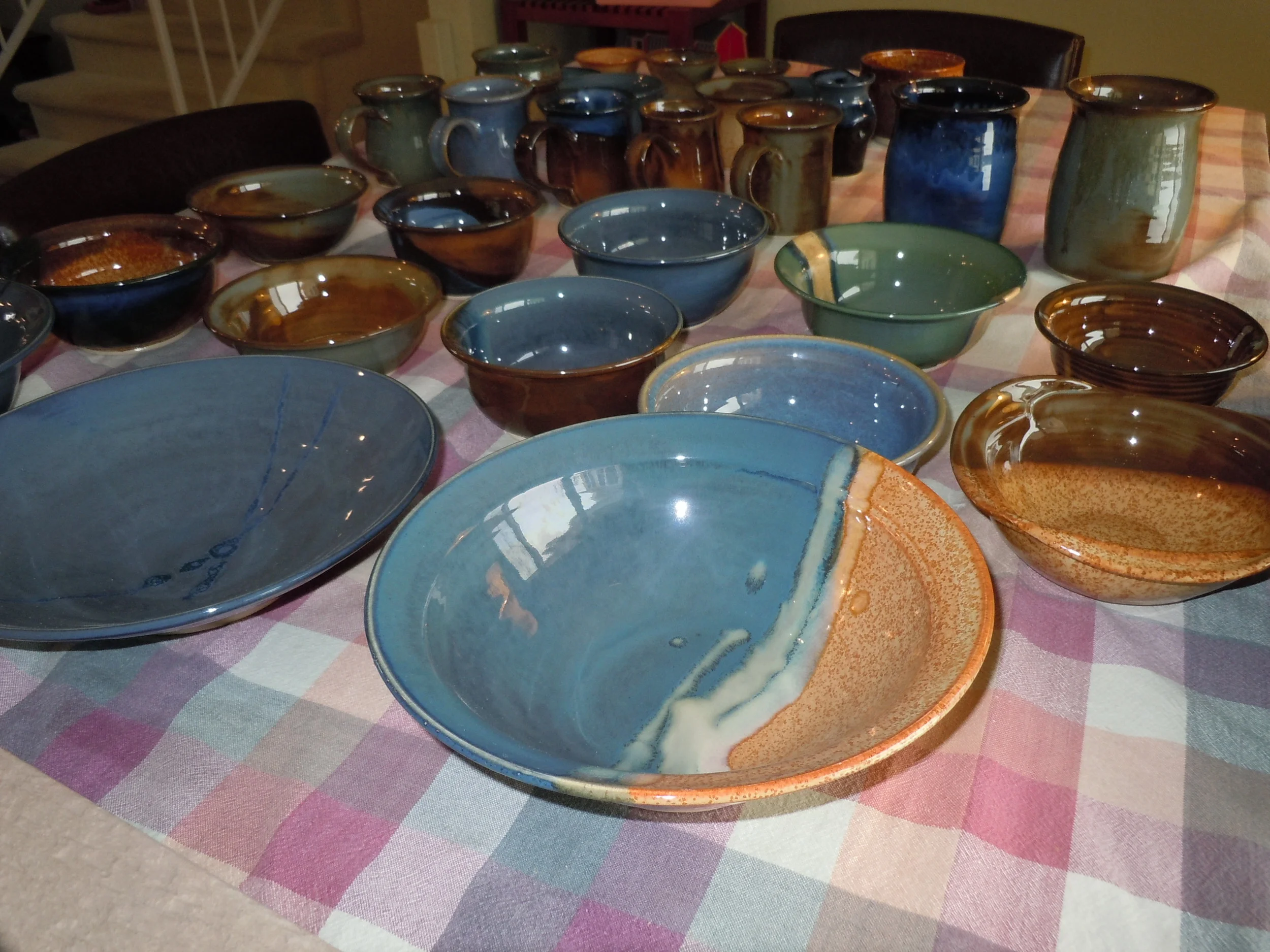 Making pottery is a slow process. I start with wet clay and shape it into the form I want, which can take one or several days, depending on the complexity of the piece. Clay must dry slow in order not to warp and once it is bone dry it is fired in the kiln the first time (bisque) to cone 4 ~ 1800 degrees. I do not to waste resources so make enough pottery to fill the 7 cubic square feet of my kiln. Once fired and cooled, each piece is unloaded and sponged and bottoms waxed. Then glazes are mixed, prepared and carefully painted/dipped onto the bisqued pottery pieces. The pottery is tediously loaded back into the kiln for the 2nd and final glaze firing (~2100 degrees) where the clay is heated to its mature temperature to ensure permeability and food-safe quality. This glaze firing takes ~9 hours to get to temperature, then another 12-24 hours to cool before I can unload each piece again and carefully inspect for any flaws or defects before I sand the bottoms and consider them complete.